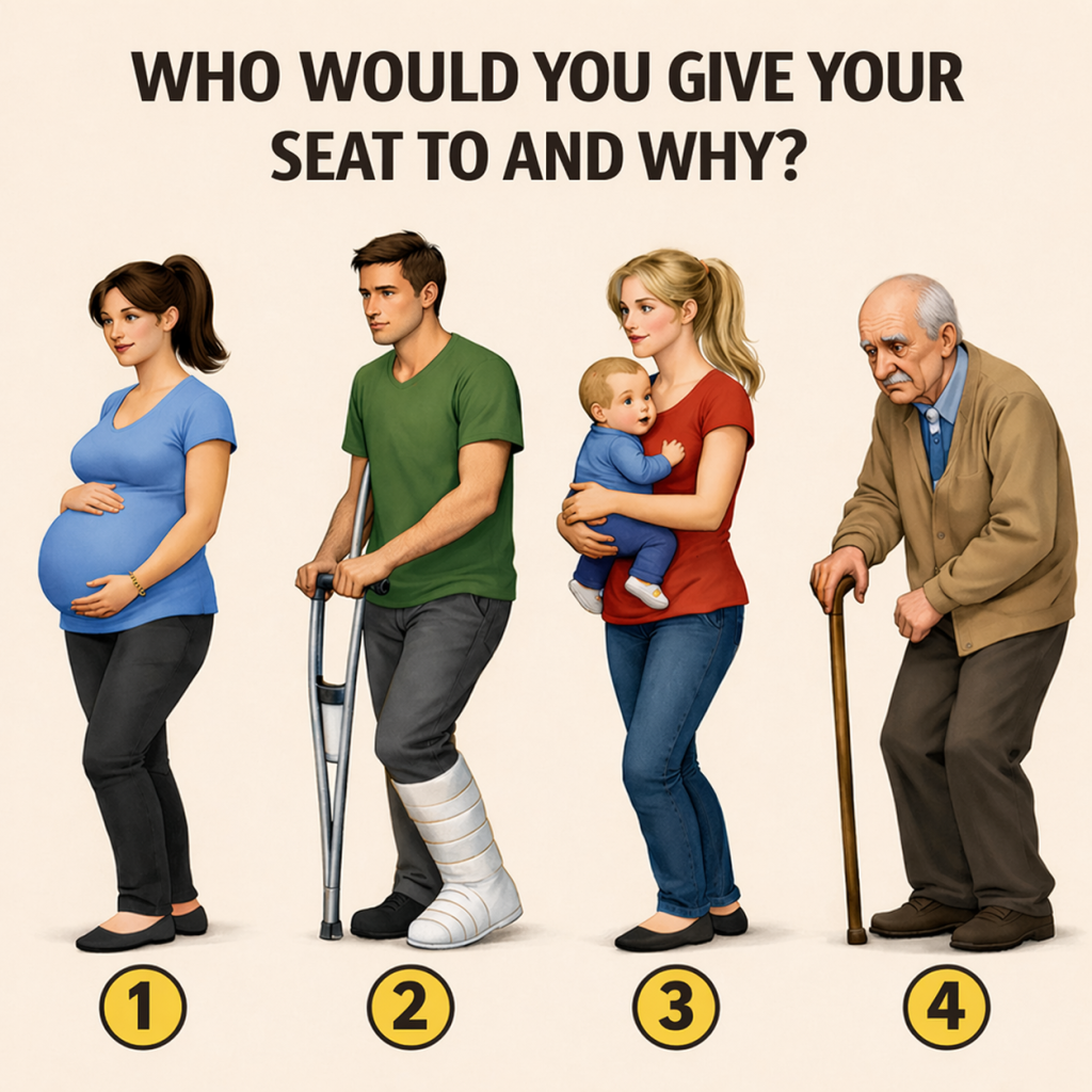 In a crowded space where comfort is limited and choices must be made, a simple question arises: Who would you give your seat to—and why? At first glance, the answer may seem obvious, but the image challenges us to look deeper into our values, instincts, and sense of empathy.